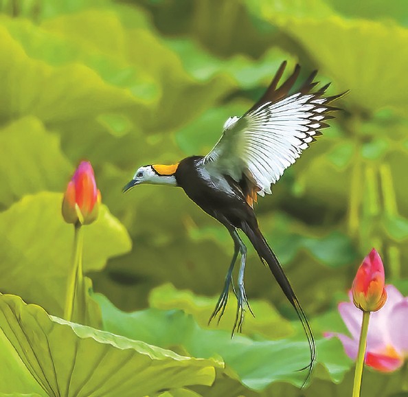水雉,号称“淡水湿地之王”,也有“水凤凰”之别名,以其独特的羽色、修长的尾羽和优雅的姿态,成为摄影师镜头下的宠儿。